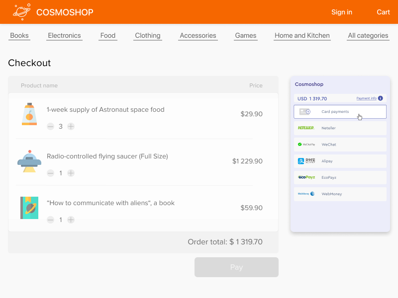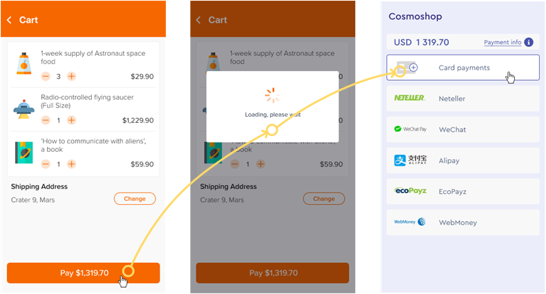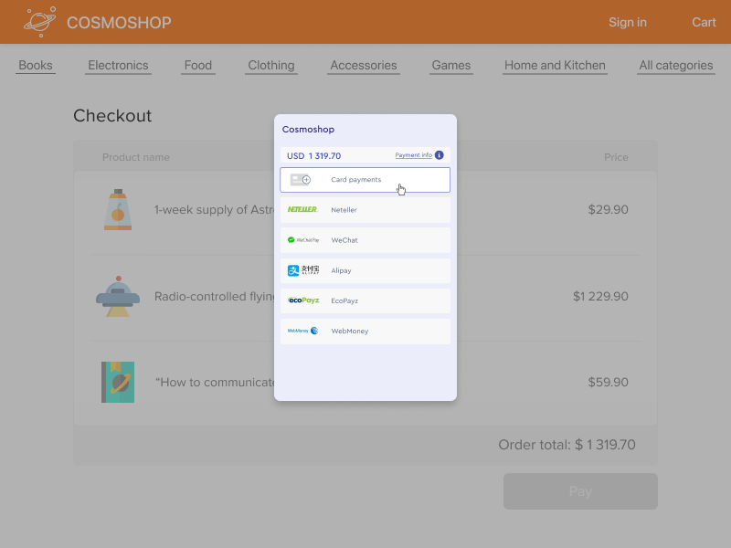 - Outside the payment form, before the payment form is opened. Payment method can also be selected on the web service side before Payment Page is opened (for instance, in an “Add to Cart” section). In this case the payment method is specified in the request for opening the payment form, and user input starts from the step of entering the payment information, without selecting the payment method.