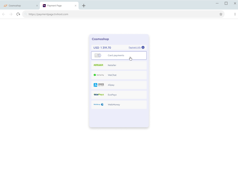 Payment Page is opened on the customer's device as a separate browser tab, a modal window or an iframe object embedded into the HTML page; standard and individual design of the payment form can be used. Payment Page display mode, the way of handling intermediate actions and showing information about the result can be configured in the request for opening the payment form. Therefore, this variety of options allows efficiently configuring Payment Page for different user stories.